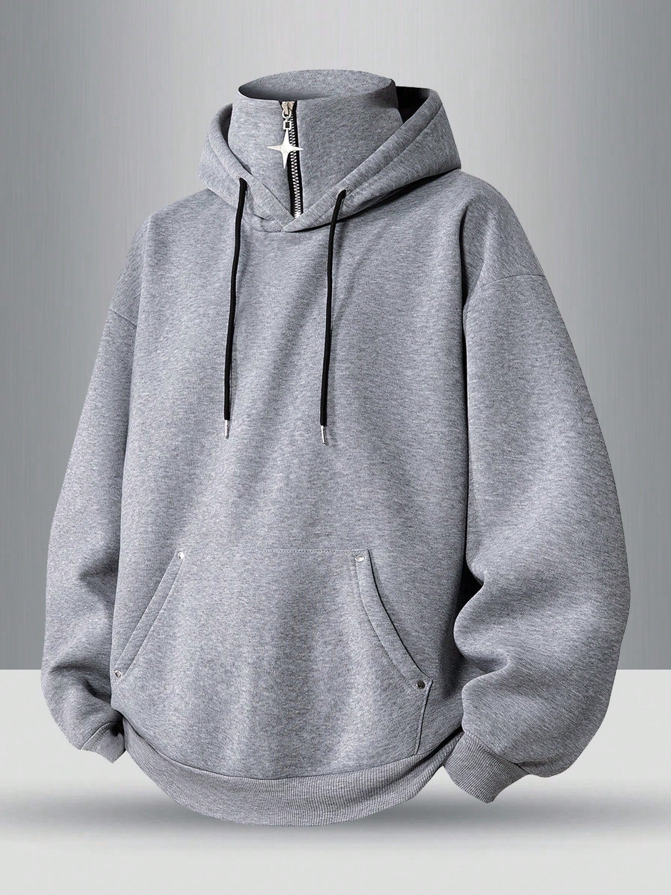 Elevate your everyday look with this grey Japanese streetwear hoodie, blending classic comfort with clean urban styling. This loose-fit pullover sweatshirt features a standout high zip-up neckline, drawstring hood, and kangaroo front pocket with metal snap detailing for a modern edge. The regular-length hem and soft woven fabric make it perfect for daily wear, offering both structure and coziness in one minimalist piece.