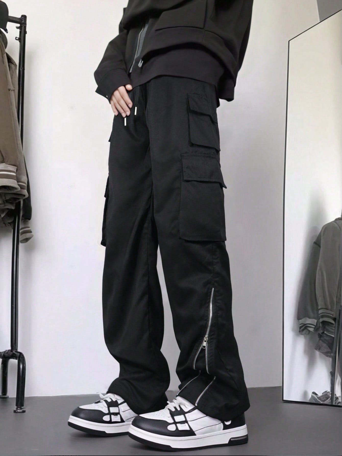 Channel sleek and functional style with these Men’s Japanese Streetwear Cargo Pants in deep black. Featuring multiple utility pockets, metal zipper accents, and a drawstring waist, these pants are inspired by modern Tokyo fashion and techwear aesthetics. Designed with a natural mid-rise fit, non-stretch woven polyester, and a long, straight-leg cut, they offer comfort, durability, and bold street style. Whether paired with oversized tops or layered with outerwear, these Japanese techwear trousers are perfect for daily urban looks, skate style, or casual street missions.