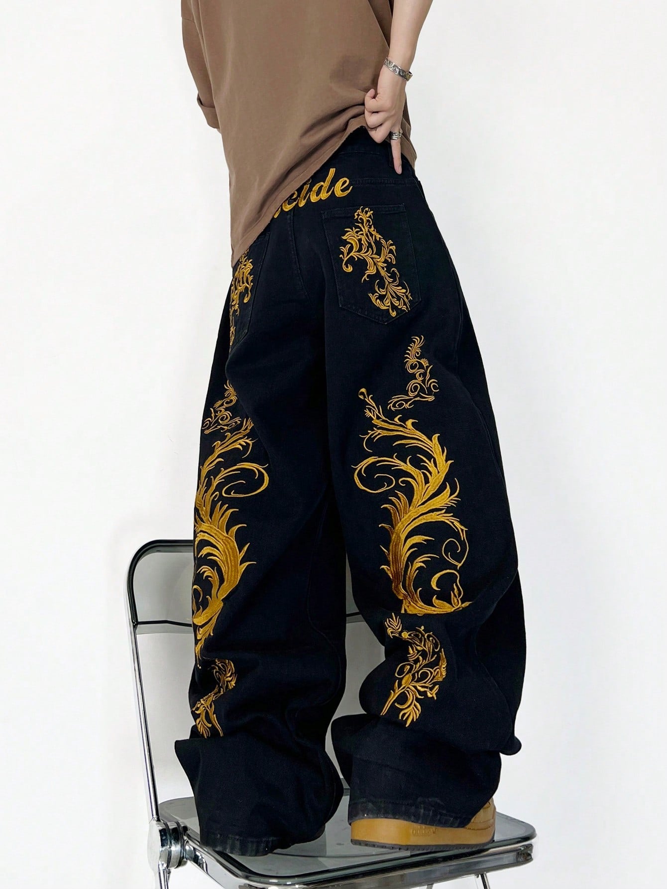 Make a bold statement with these Japanese streetwear embroidered wide-leg jeans, featuring intricate gold gothic embroidery that contrasts perfectly against the black denim base. Designed with a loose oversized fit, natural mid-waist, and wide-leg cut, these pants embody the essence of Tokyo street fashion with a gothic-punk edge.