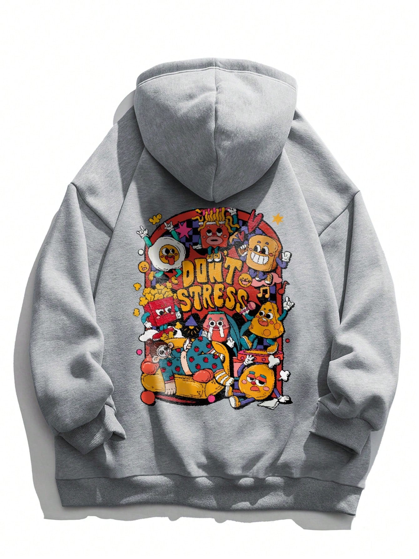 Brighten up your streetwear lineup with this grey cartoon hoodie featuring a vibrant “DON’T STRESS” graphic print packed with colorful, quirky characters. Perfect for fans of Japanese playful fashion, this piece brings carefree energy to your everyday look. The drop shoulder sleeves, regular fit, and soft fabric make it ultra-comfortable, while the bold illustration adds a fun twist to your hoodie collection.