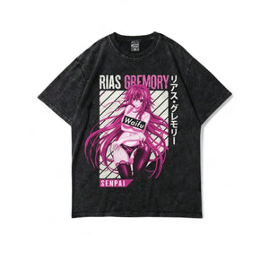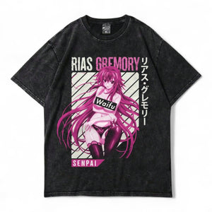 Turn heads with this bold Rias Gremory Waifu T-Shirt, featuring the iconic anime character from High School DxD in an eye-catching magenta print. This shirt is a tribute to classic anime fan culture, complete with "Waifu" and "Senpai" labels and vertical Japanese katakana text for an authentic Japanese streetwear vibe.