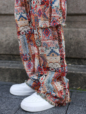 Make a bold artistic statement with these Boho Patchwork Flare Pants, featuring an intricate vintage tapestry print inspired by global nomadic styles. Crafted with a rich all-over pattern, these loose-fitting flare-leg trousers combine avant-garde energy with laid-back bohemian freedom.