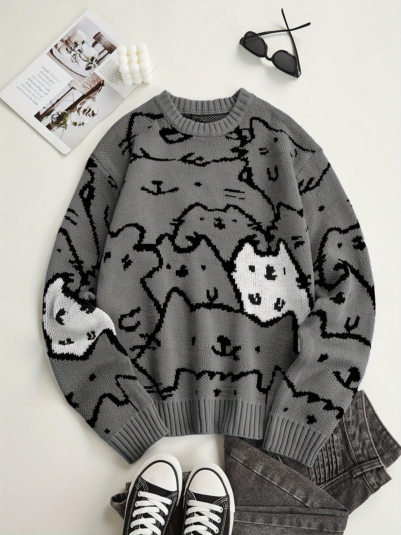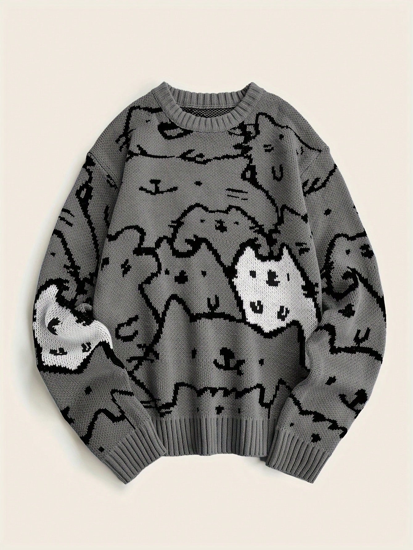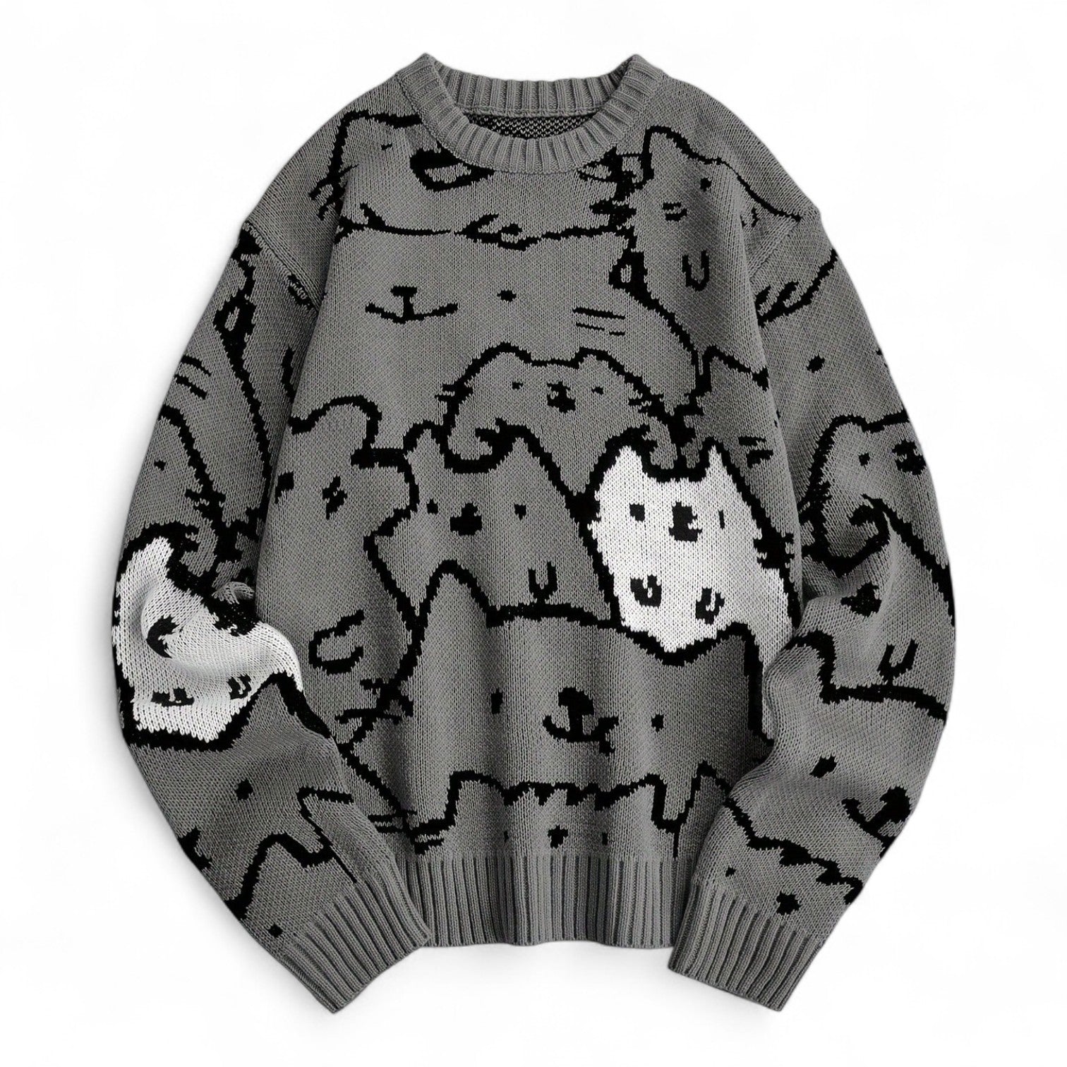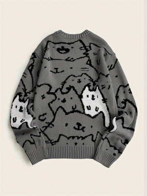 This grey cat-print knit pullover brings adorable character to your cool-weather wardrobe. Covered in an all-over cartoon cat face design, it's the perfect mix of playful and comfortable — ideal for fans of kawaii fashion, anime aesthetics, or Japanese-inspired streetwear.