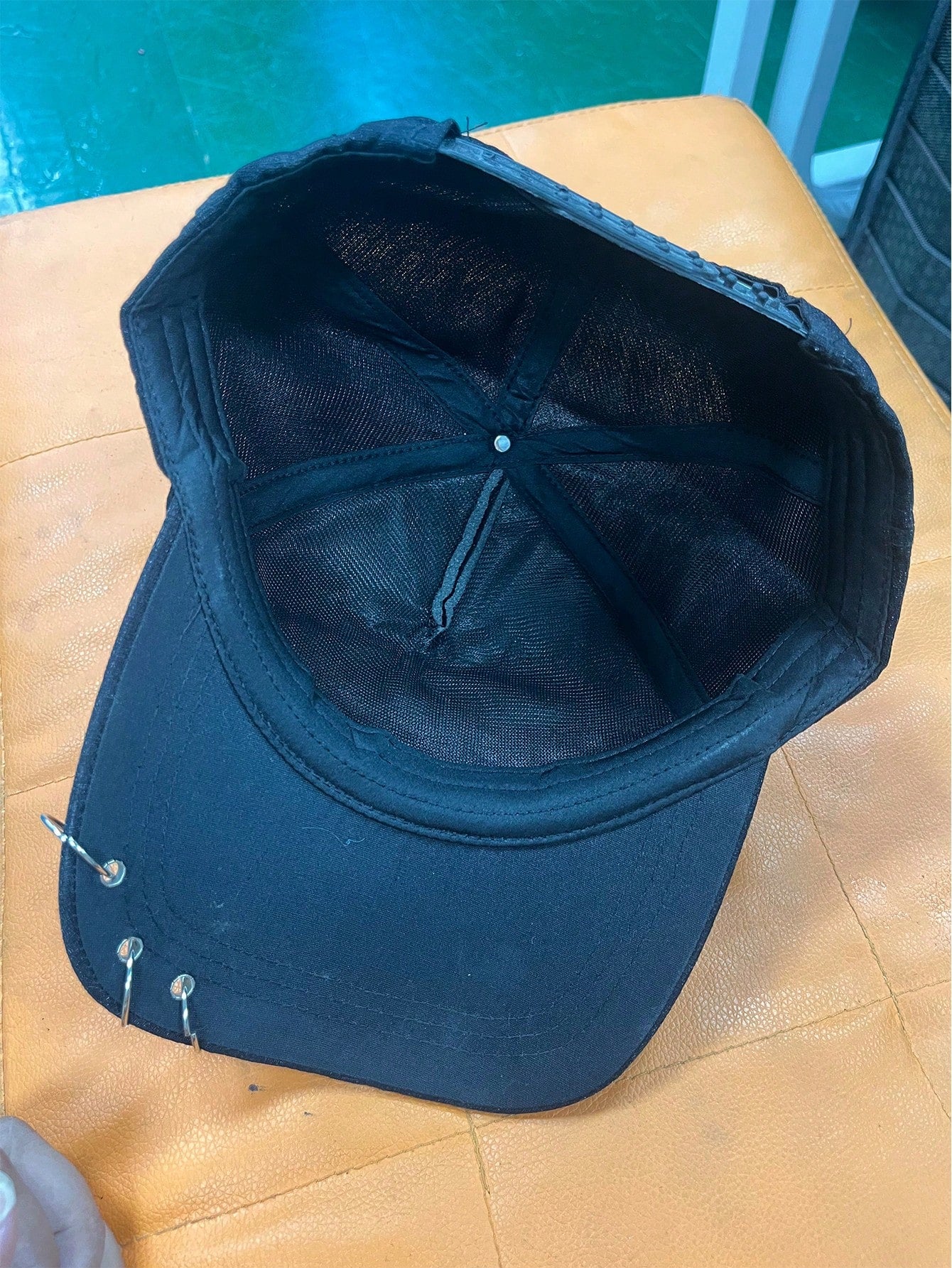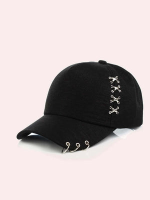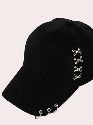 This black curved-brim cap brings minimalist style with maximum attitude. Detailed with metal rivets and faux piercings, it's a staple for edgy, alternative fashion fans.