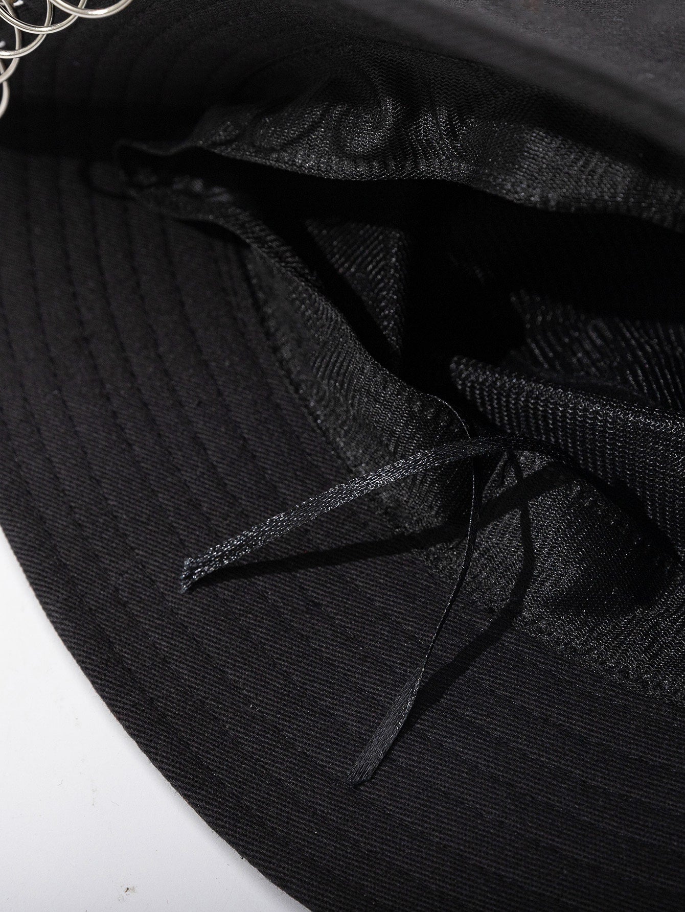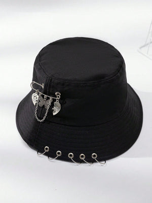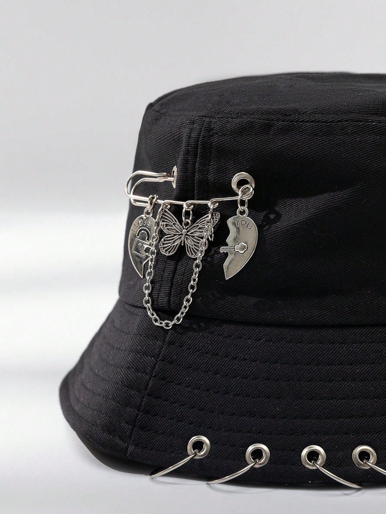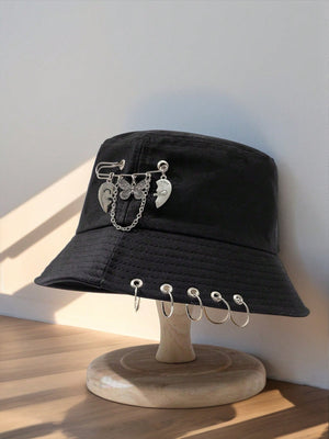 This black bucket hat fuses soft streetwear with metallic attitude. Featuring dangling silver-toned safety pins, butterfly and heart charms, and pierced eyelet rings, this is your statement accessory for any season.