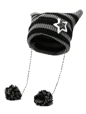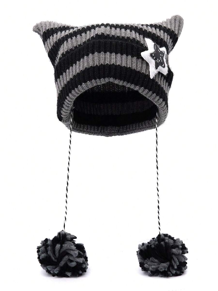 Make your winter outfits pop with this adorable striped cat ear beanie for women. Featuring bold black and gray stripes, soft pointed ears, a stitched star patch, and fluffy pom-pom tassels, it’s the perfect blend of fun and function.