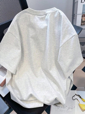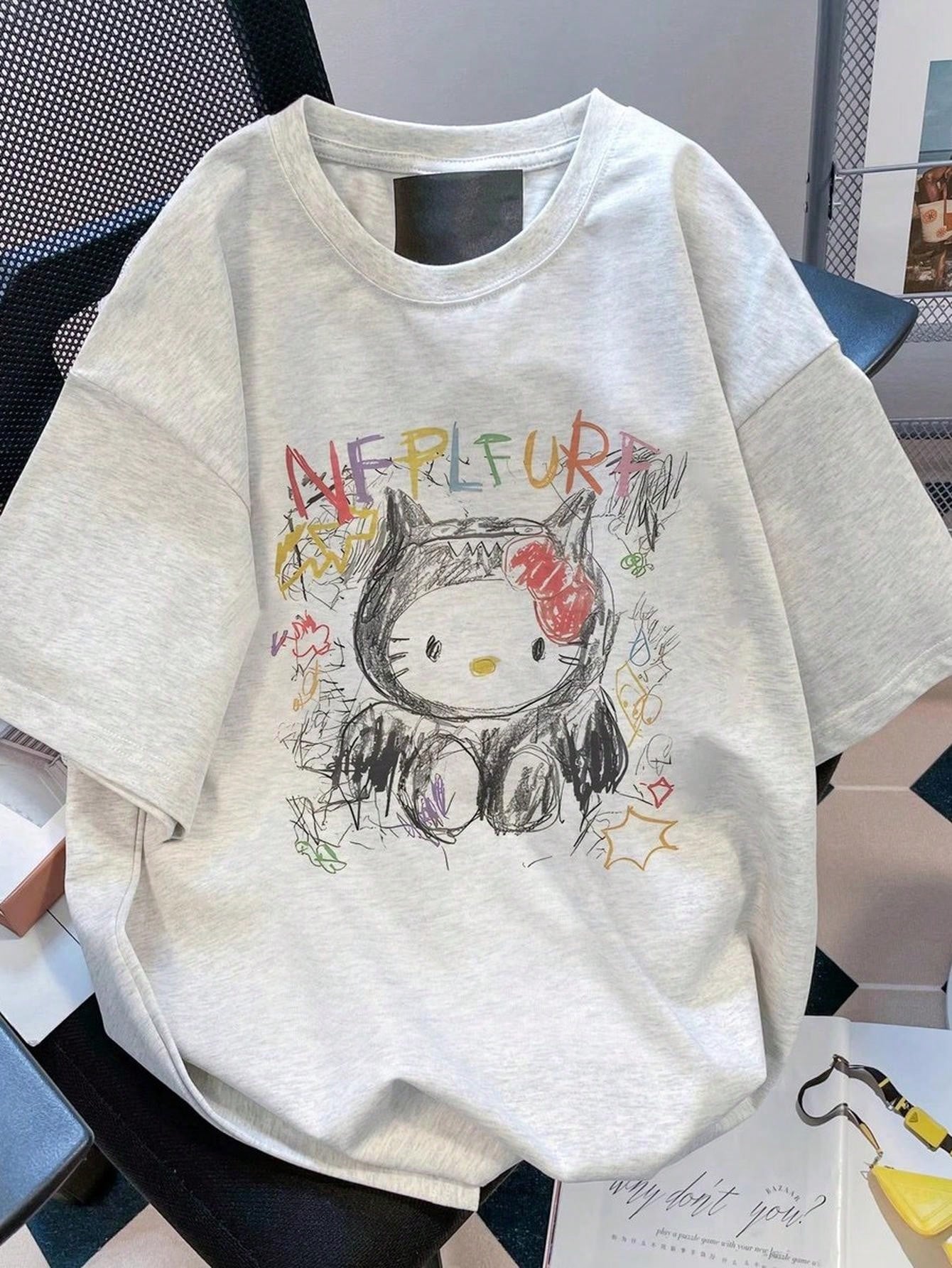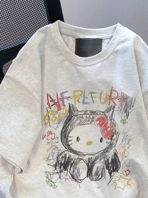 Unleash your inner rebel with this Japanese streetwear-inspired T-shirt featuring a hand-drawn Hello Kitty-style character with bat wings and graffiti-style sketch art. The light gray color and soft knitted cotton make it perfect for daily wear, while the drop shoulder design and loose fit keep things cool and casual. With a mix of cartoon and plant doodles, this tee captures an edgy Harajuku aesthetic that stands out in any crowd. Whether you're pairing it with cargo pants, mini skirts, or street boots, this tee brings playful chaos to your outfit in the best way.