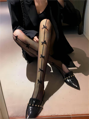 Elevate your legwear with these stunning fishnet tights featuring a back seam ribbon design and delicate satin bows. The geometric net pattern creates a bold silhouette, while the trailing bows down the legs add an irresistible touch of femininity and charm.