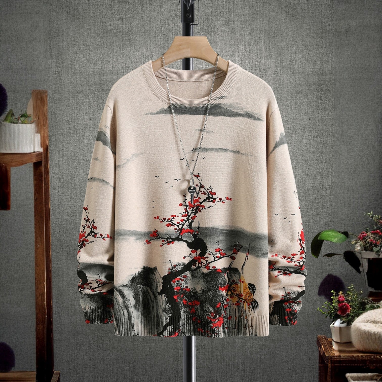 Bring traditional art into your everyday style with this Japanese-inspired knit pullover, featuring an elegant crane and cherry blossom print in classic ink-wash brushwork style. The tranquil landscape motif and flowing tree branches create a visually poetic look, perfect for fans of Asian aesthetics, minimal fashion, and artwear.