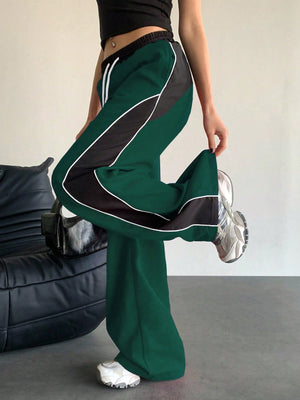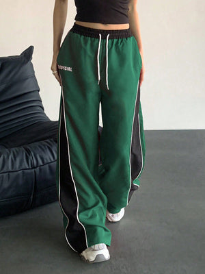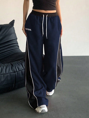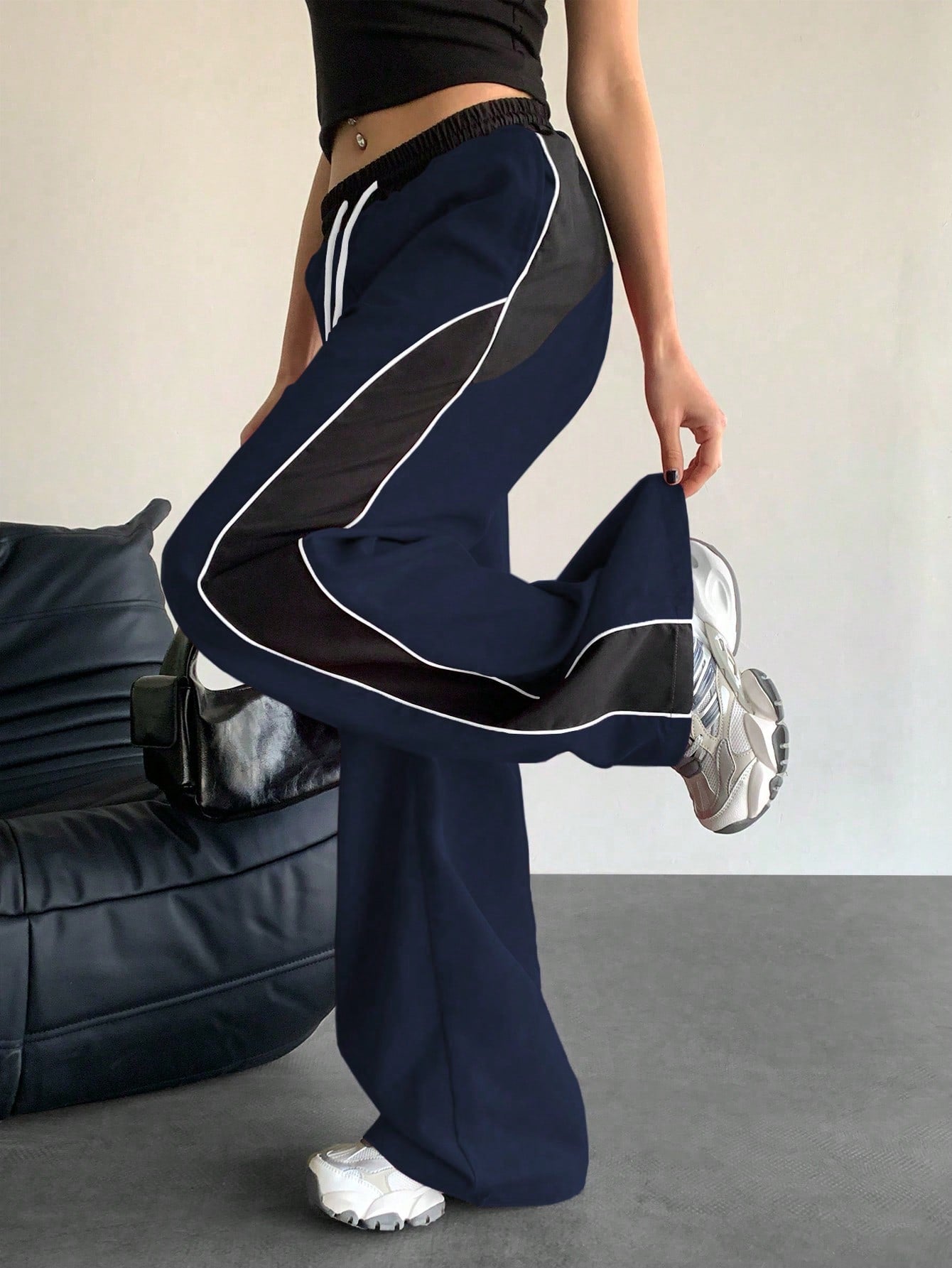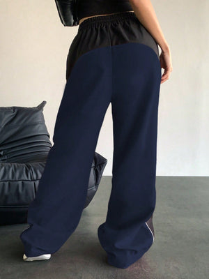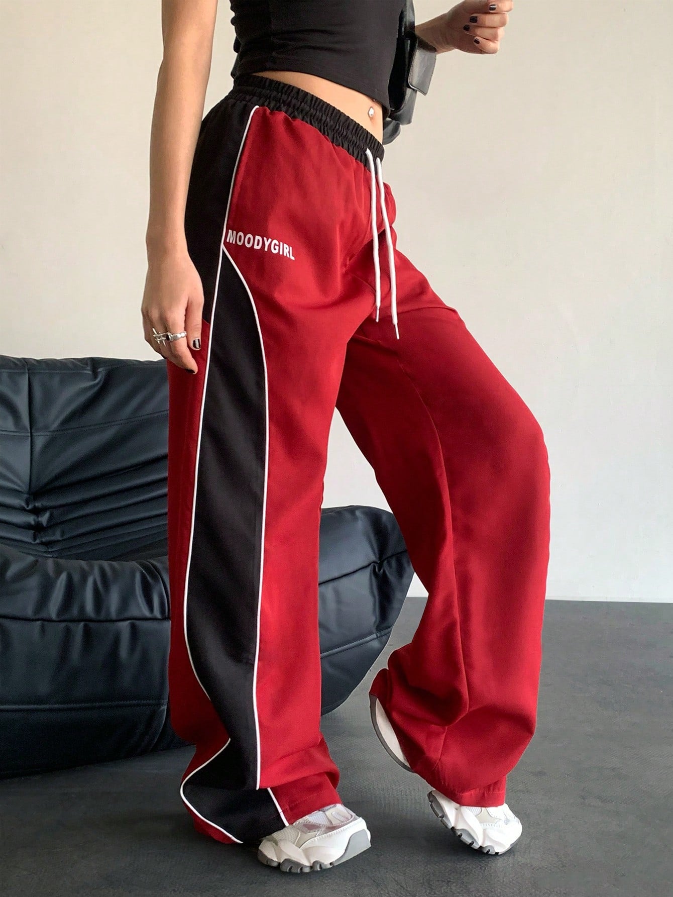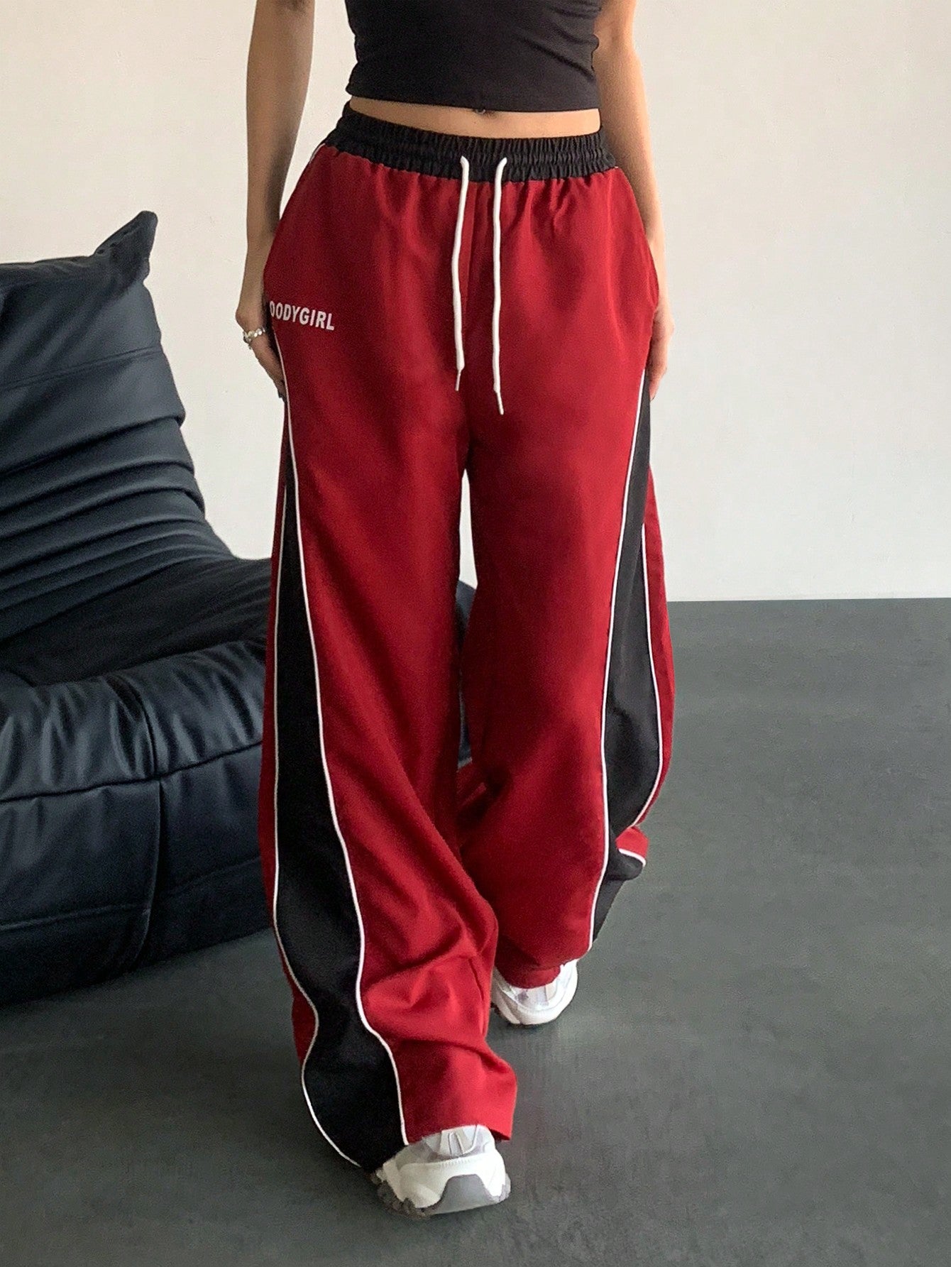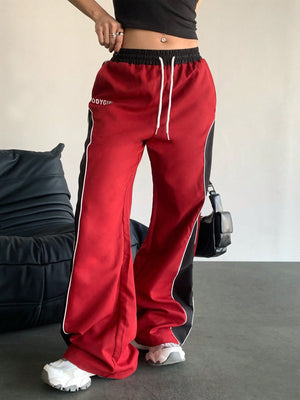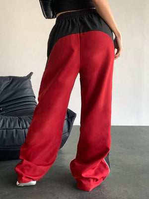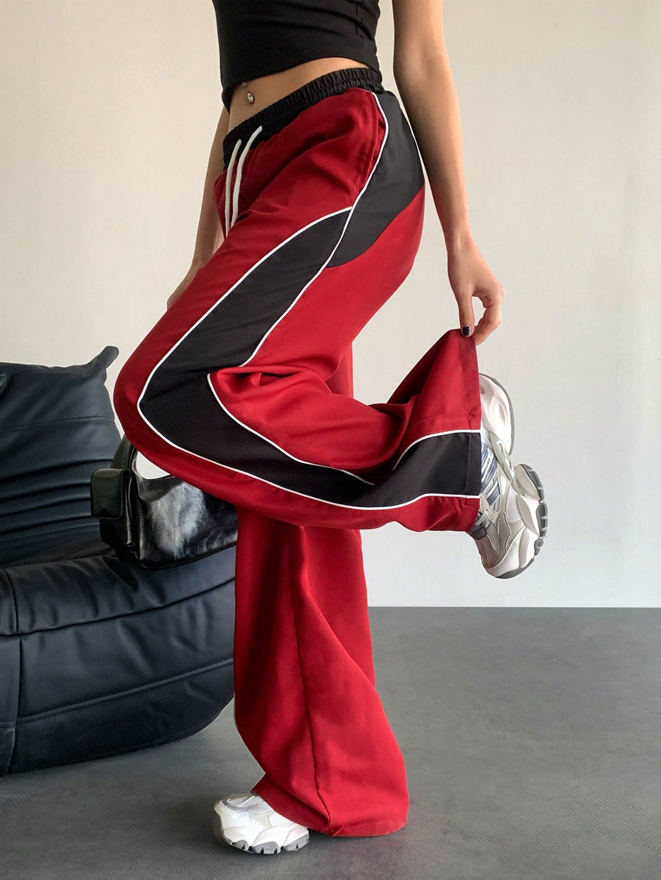 Add a bold streetwear statement to your wardrobe with these red colorblock wide-leg track pants. Featuring a relaxed loose fit, contrast black side panels with piping, and a sporty drawstring waist, they combine comfort and style effortlessly.