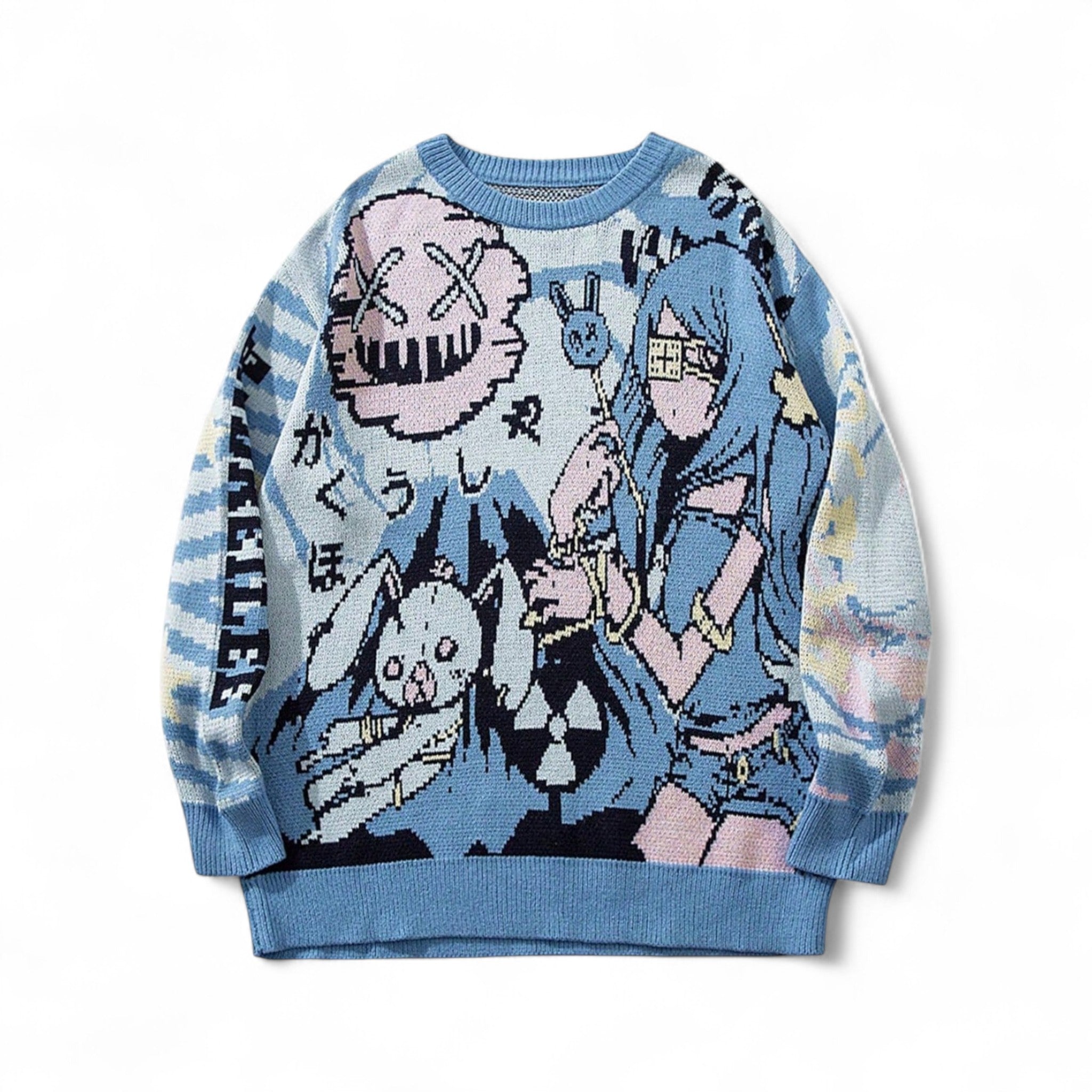 Japanese streetwear anime knit sweater blue cartoon pullover drop shoulder Harajuku cute style