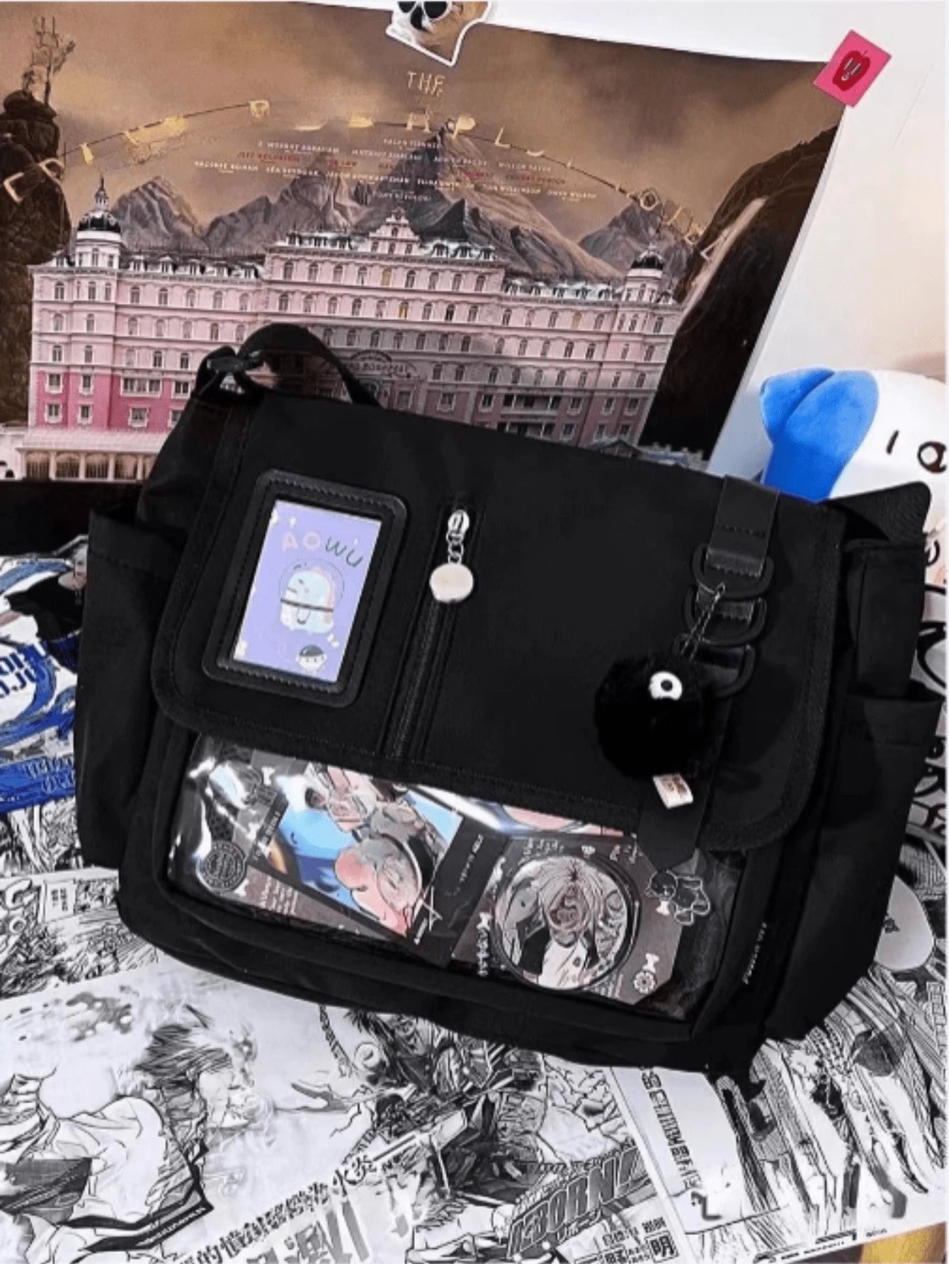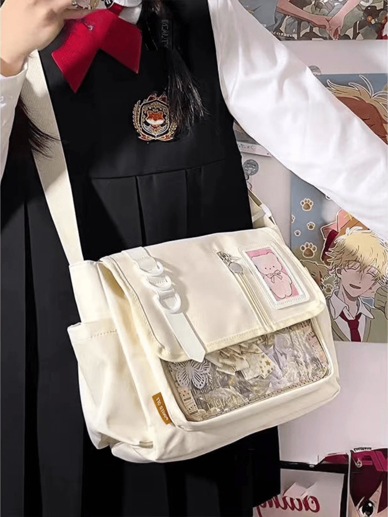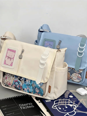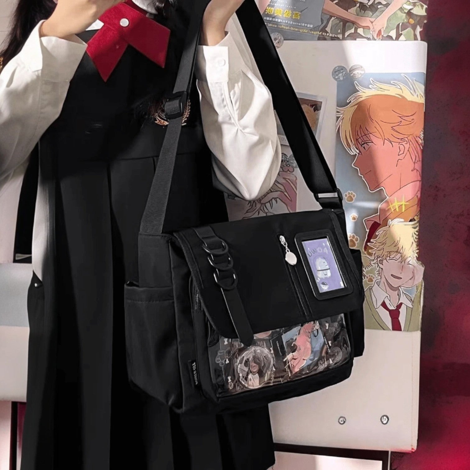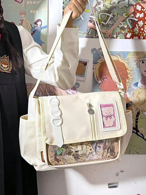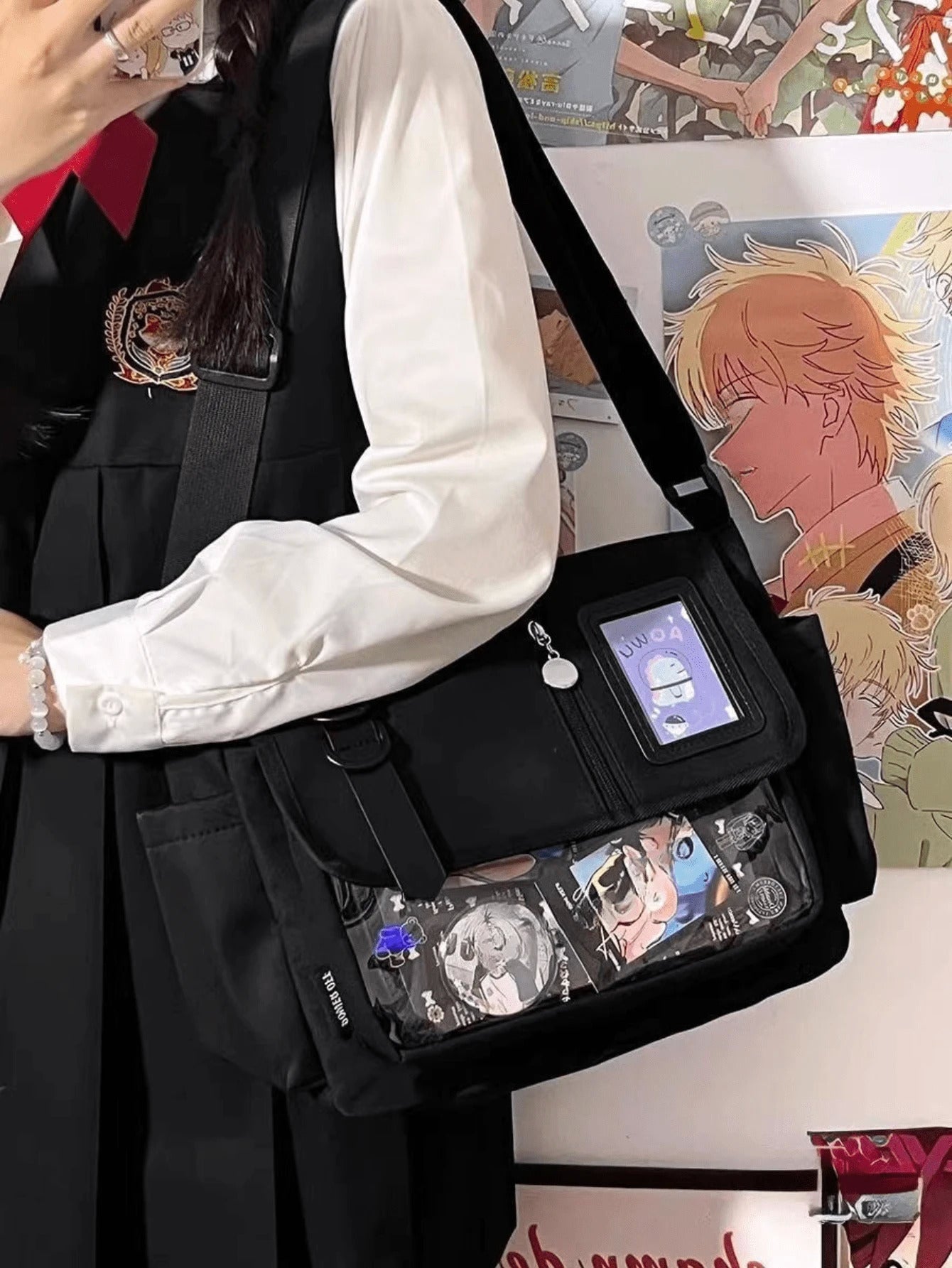 arry your fandom with flair using this preppy-style messenger Ita bag, made from durable black nylon and featuring a clear front display window perfect for showcasing anime badges, cards, and keychains. Designed with buckle and chain accents, this multi-compartment medium-sized school bag balances function and fashion effortlessly. The adjustable shoulder strap and flap closure ensure comfort and security, making it ideal for daily school use, conventions, or simply styling with your favorite J-fashion or streetwear look.