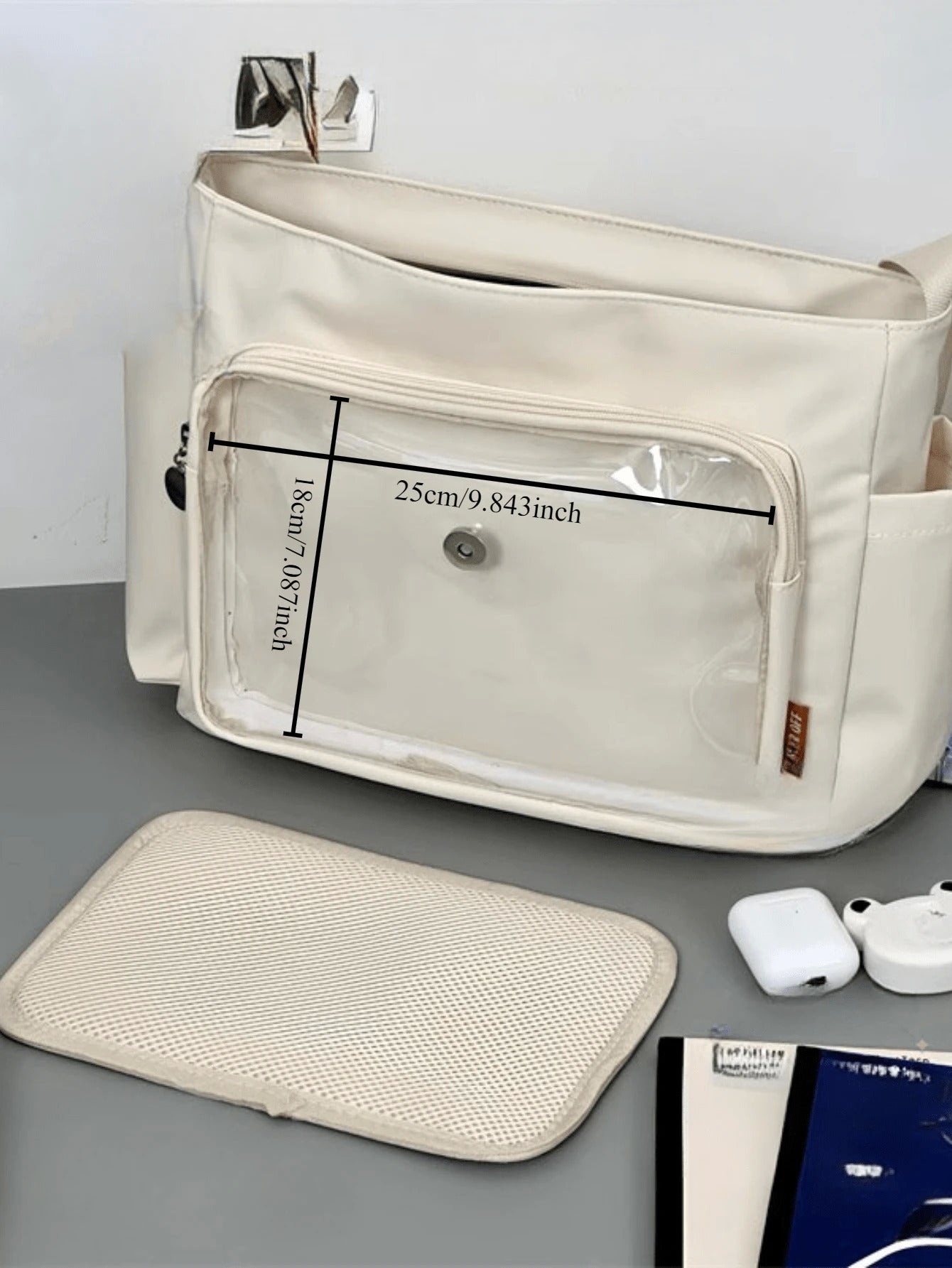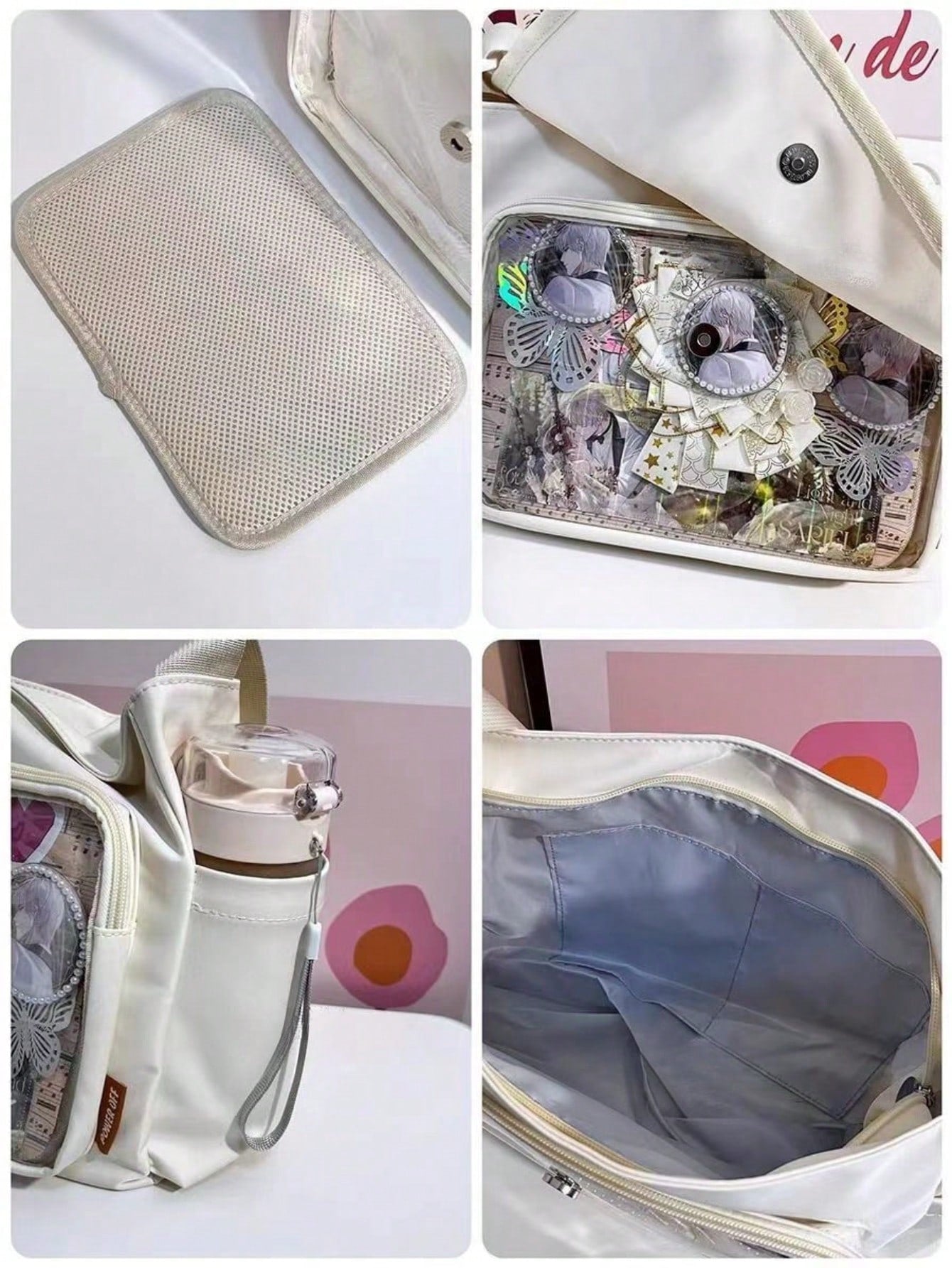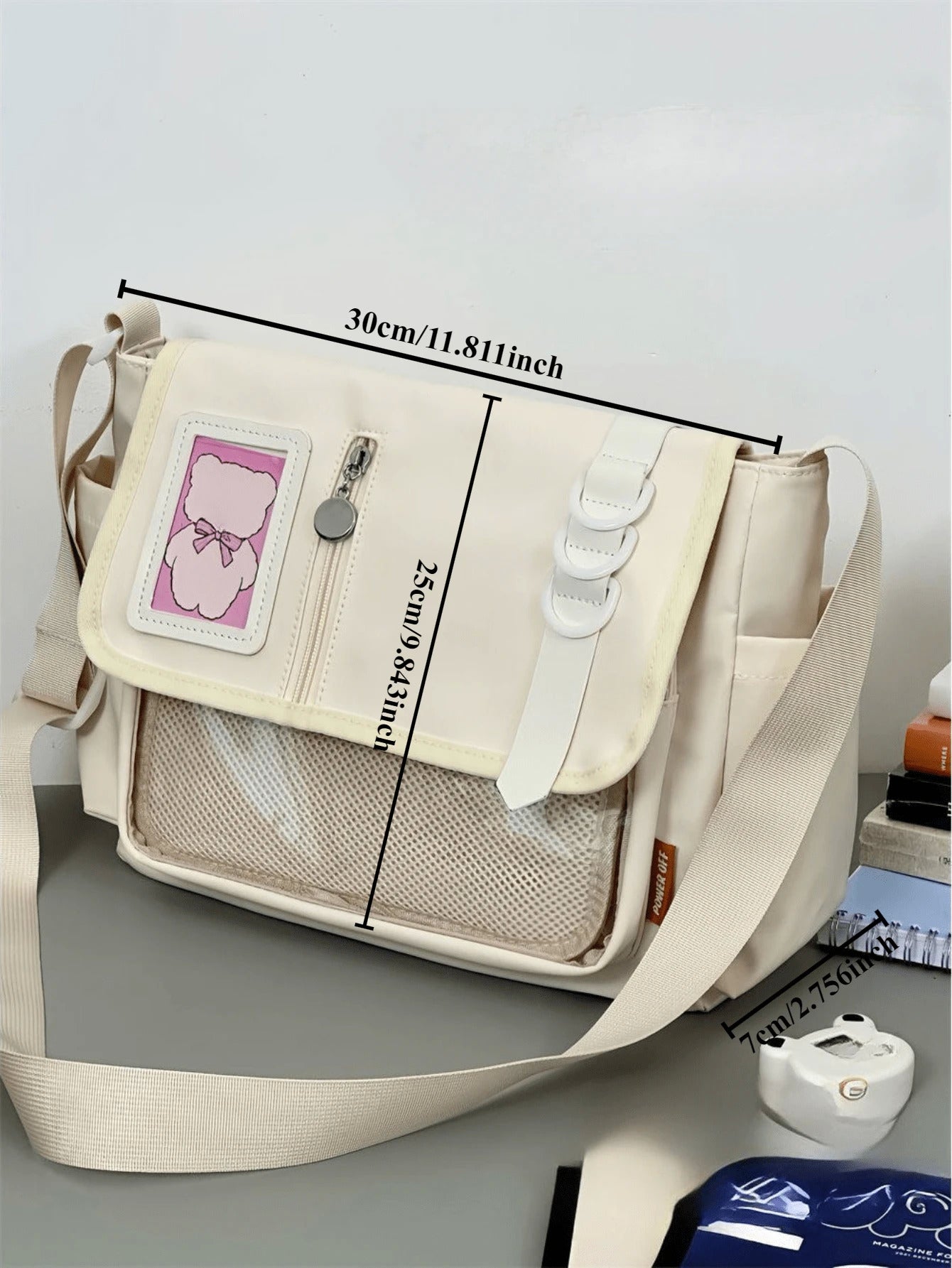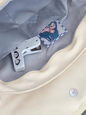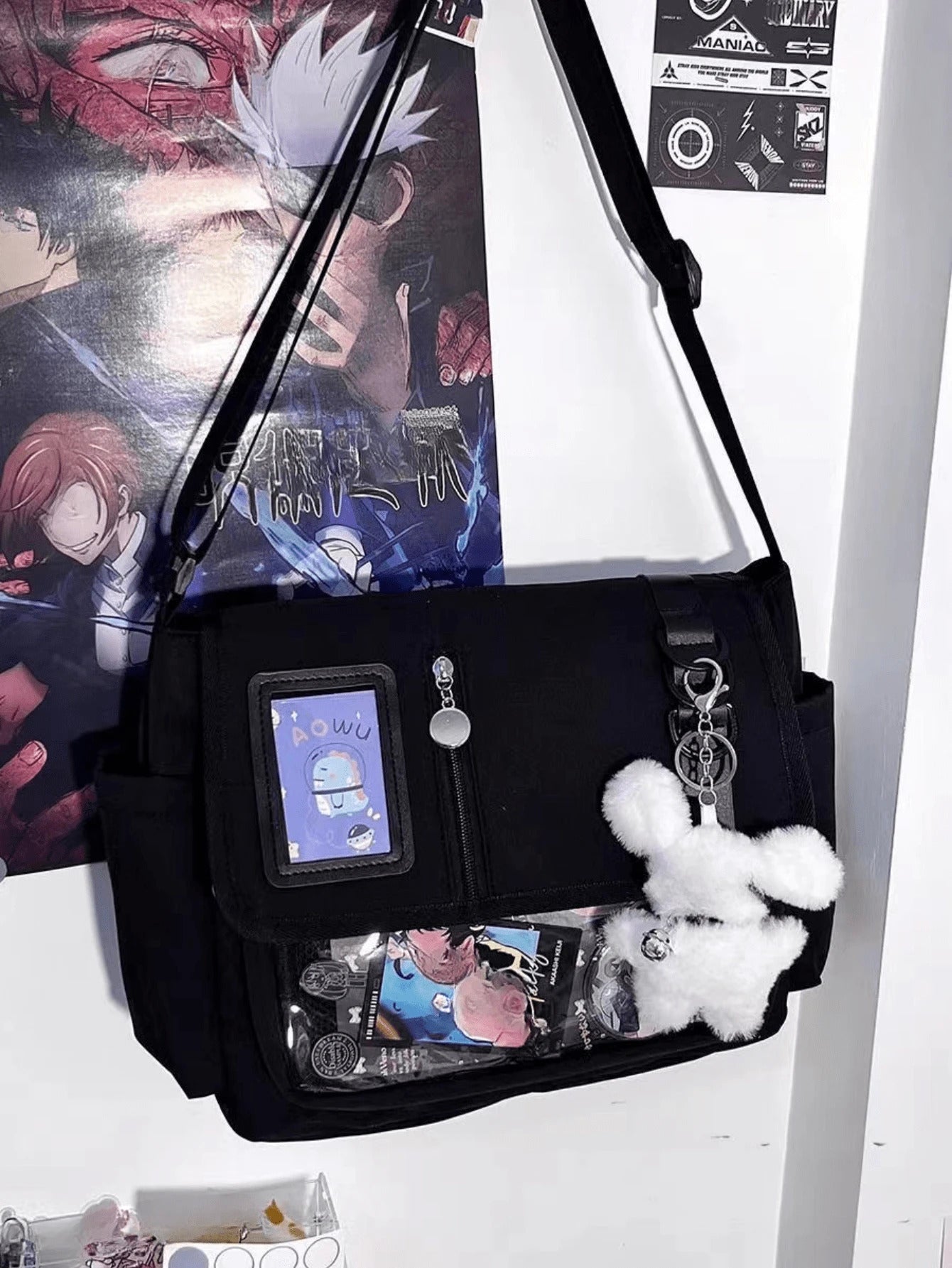 arry your fandom with flair using this preppy-style messenger Ita bag, made from durable black nylon and featuring a clear front display window perfect for showcasing anime badges, cards, and keychains. Designed with buckle and chain accents, this multi-compartment medium-sized school bag balances function and fashion effortlessly. The adjustable shoulder strap and flap closure ensure comfort and security, making it ideal for daily school use, conventions, or simply styling with your favorite J-fashion or streetwear look.